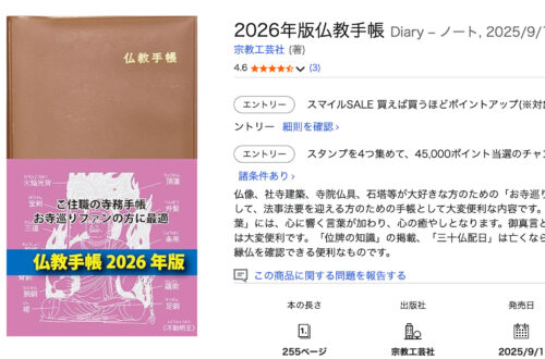 仏教と仏事に関するあらゆる情報が詰まった2026仏教手帳、好評発売中です。 お寺巡りをされる方、檀家総代の皆さん、ご住職、仏壇仏具店の皆様に長らくご愛用頂きます。 ご注文はAmazonより。