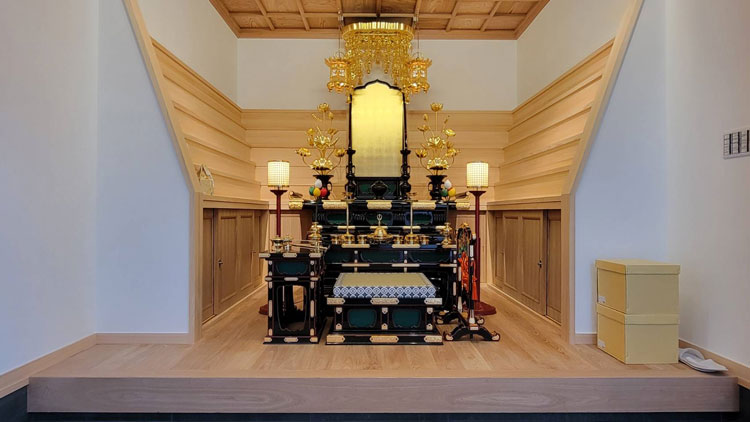 浜屋は納骨壇施工にも数多くの実績を持つ。今回紹介する安養寺様(兵庫県尼崎市・浄土真宗本願寺派)は寺院に隣接する一軒家をフルリメイクし納骨壇施設を新設。一階は多段型、二階は2家型、三階は1家型とフロアごとにタイプを分け檀家様を中心に新規開設後、好評を博している。エントランスにはお内仏とし円窓の板に金箔を施したバックパネルの前に阿弥陀様をお迎えし、お詣りの方は合掌して堂内に入られます。